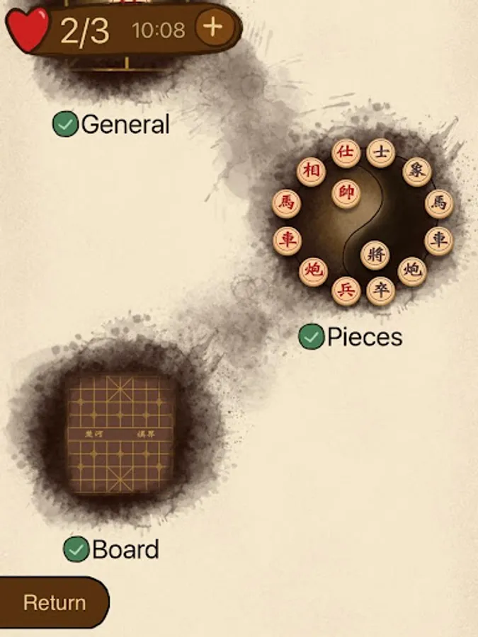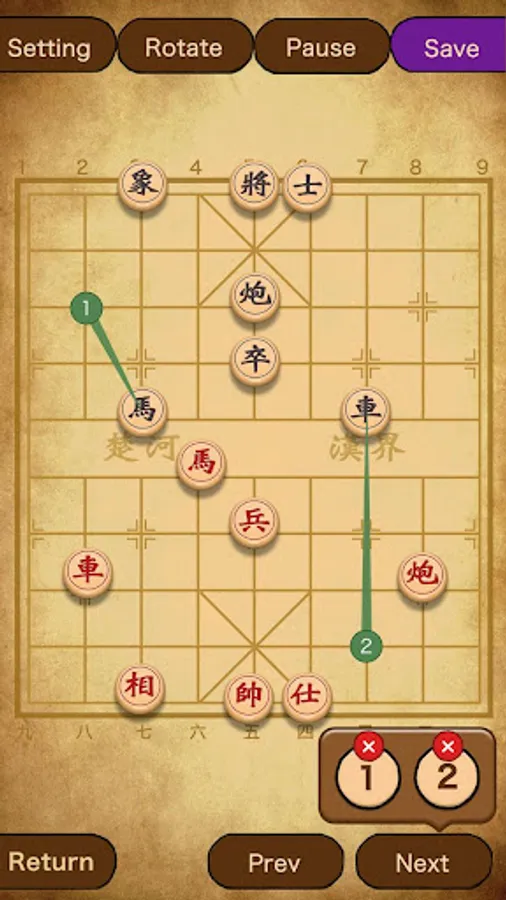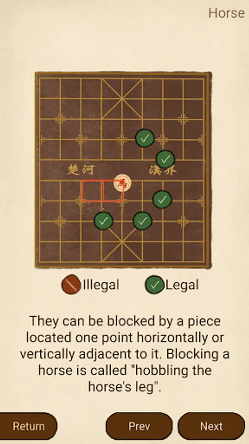 The game represents a battle between two armies, with the object of capturing the enemy's general (king). Distinctive features of xiangqi include the cannon (pao), which must jump to capture; a rule prohibiting the generals from facing each other directly; areas on the board called the river and palace, which restrict the movement of some pieces (but enhance that of others); and placement of the pieces on the intersections of the board lines, rather than within the squares. -- From wikipedia.