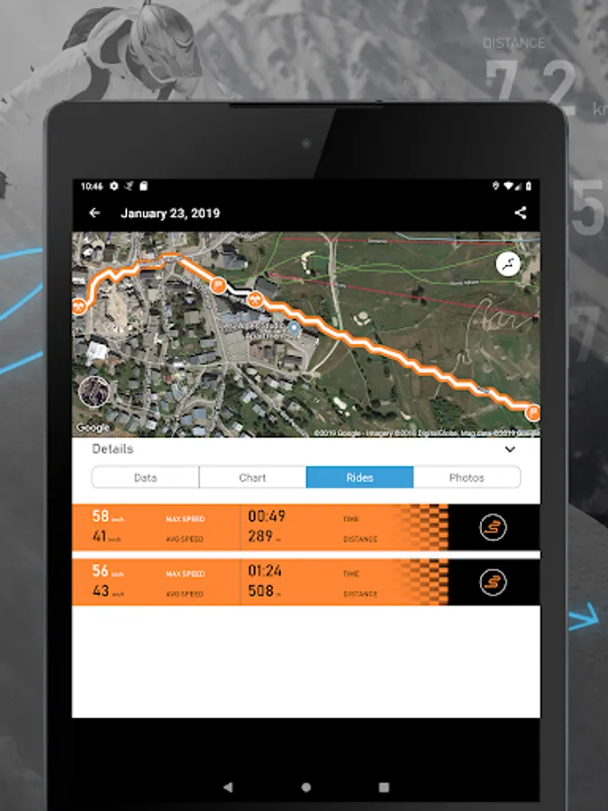 Simply tap or move your finger over the chart to see when and where a given value occurred. You can also choose from multiple snowbound activities, the app will function as a speedometer, calorie counter, keep track of checkpoint times, alert you with notification sounds at pre-set milestones, and even auto pause should you decide to stop somewhere for coffee or to take a photo. If you do stop to take photos, they can easily be added with the data of your current position overplayed right on top. Your photos will have- elevation, average speed, location and even route info right on them.