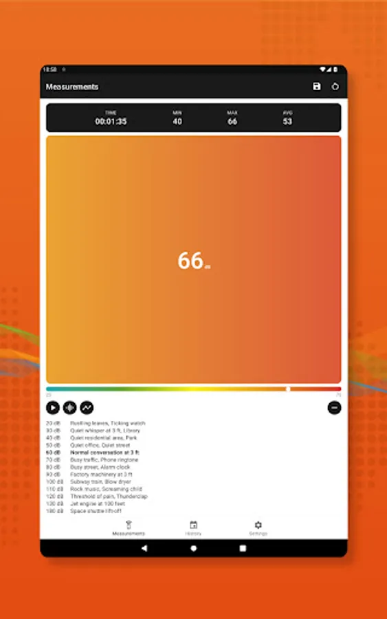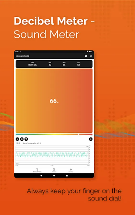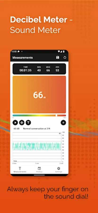 Turn your smartphone into a sound measuring device. Our app uses built-in microphone to display current decibels level with corresponding easily readable text description, you can start/stop measurement to get average, min and max values from specific period of time.