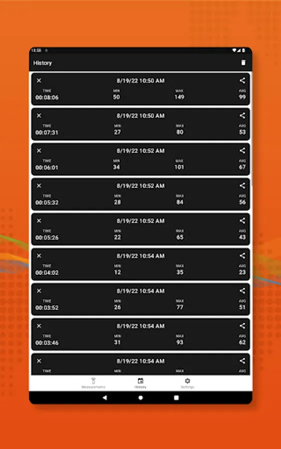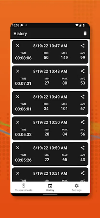 History screen allows you to see your saved data with date, time, avg, max values along with CSV file from whole span of measurement, also you can share all data you want.