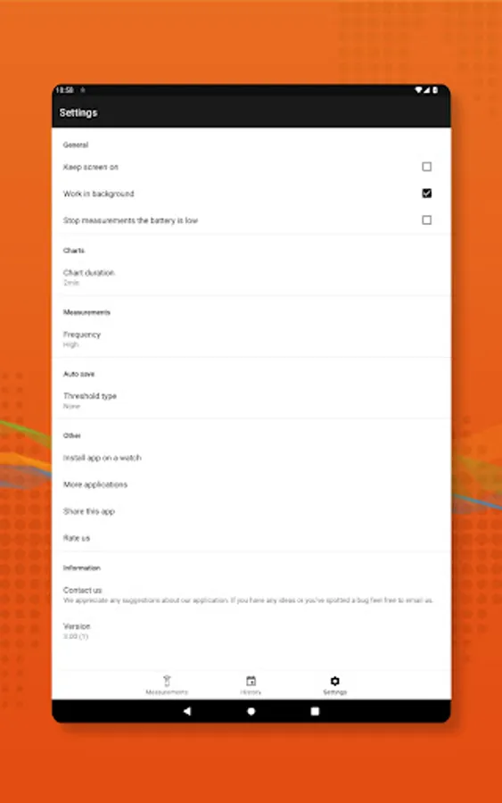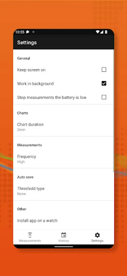 In settings, you can set up chart length according to your needs - if you want to see short period of time or longer time span. Also, you can set up to keep a screen on to have an eye on your recordings all the time.