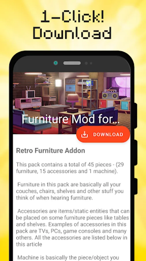 We design this app to make it easy to download & install Minecraft Furniture Addons into your mobile device. With 1-Click installer, everything will be done in few seconds!