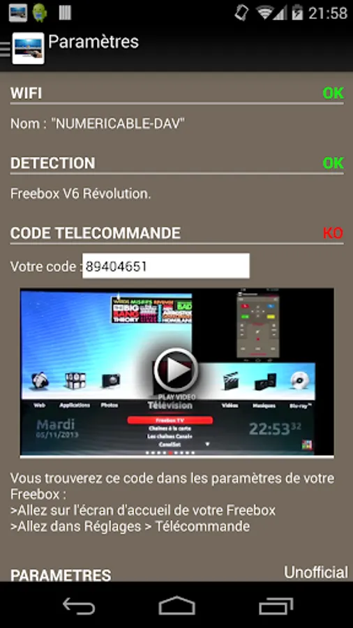 Once downloaded the application, you simply enter your remote code available in the "General Information" of the Freebox HD / Revolution section in the security code field in the settings (8-digit code).