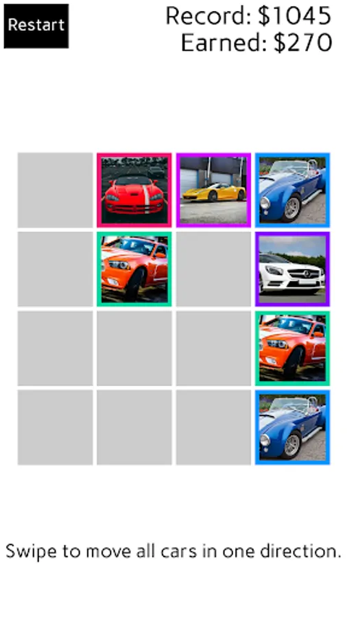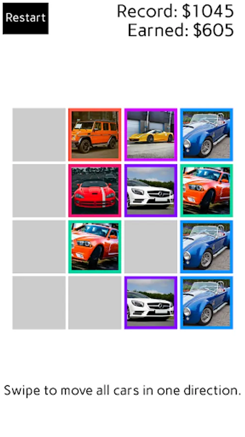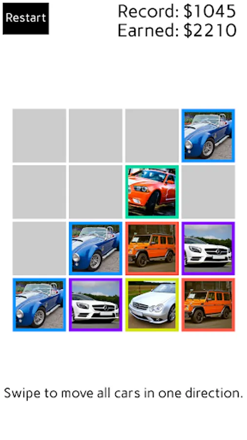 You have a personal collection of automobiles: luxury, sport, racing, muscle and other vehicles. Move 2 similar cars to "merge" them into another car of a higher rank. See how long you can last and how many cars you can fit in. To get a rank-10 vehicle in this game, you'd need to combine 1024 simple cars, for rank 11 - 2048, for 12 - 4096. Can you reach even higher ranks?