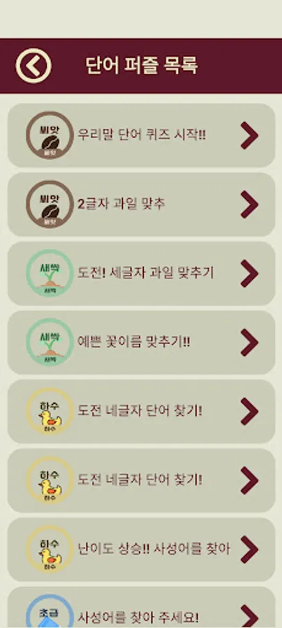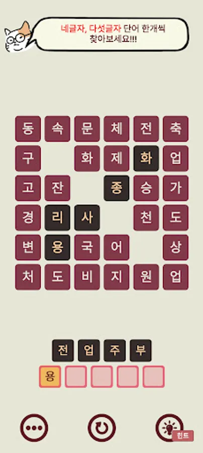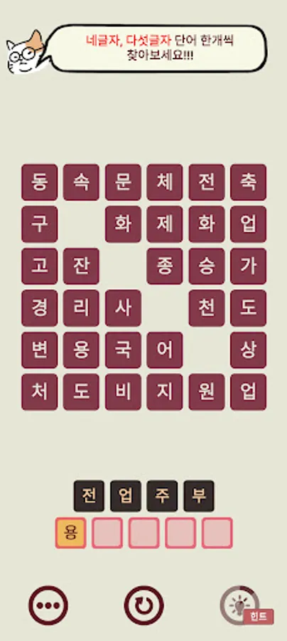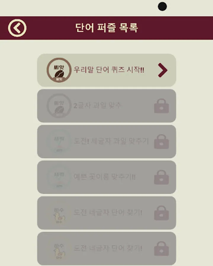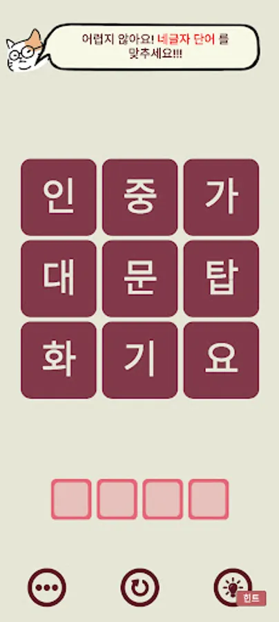 A word puzzle that consists of large letters and easy words in Korean and can be enjoyed comfortably through repeated learning at any time!!!