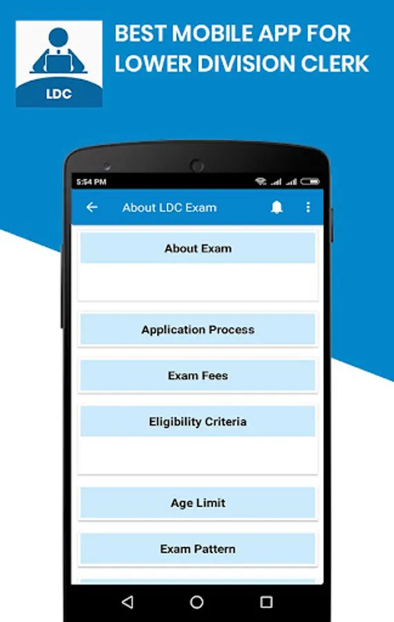 Our App provides complete details about LDC exam (paper I, paper II), including latest updated exams details like Exam pattern, Eligibility criteria, Total Vacancies, Notification dates, Pay Scale, Selection Process, Subject wise detailed syllabus, cut off, Paper Analysis etc.