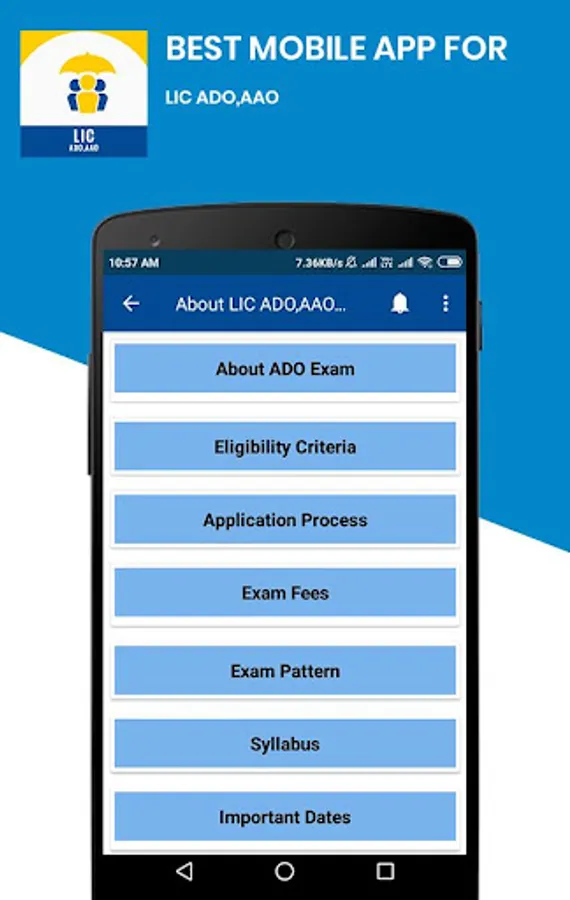 Our App provides complete details about LIC ADO,AAO exam, including latest updated exams details like Exam pattern, Eligibility criteria, Total Vacancies, Notification dates, Pay Scale, Selection Process, Subject wise detailed syllabus, cut off, Paper Analysis etc.