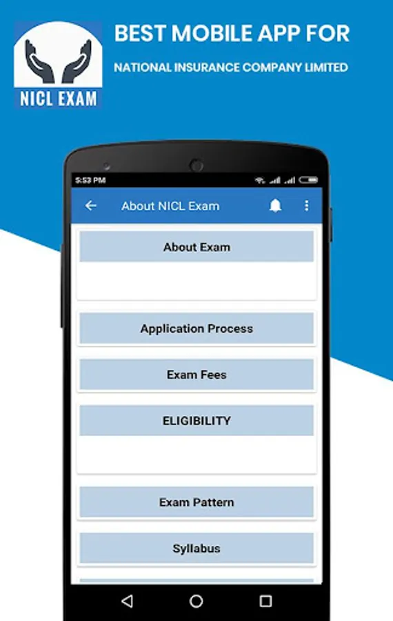 Our App provides complete details about NICL exam (prelims, mains), including latest updated exams details like Exam pattern, Eligibility criteria, Total Vacancies, Notification dates, Pay Scale, Selection Process, Subject wise detailed syllabus, cut off, Paper Analysis etc.