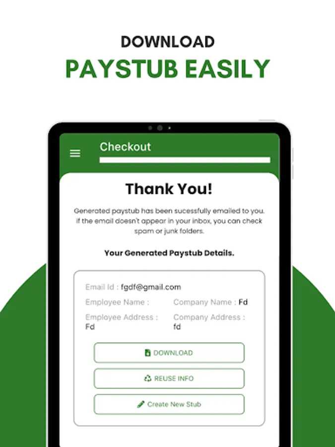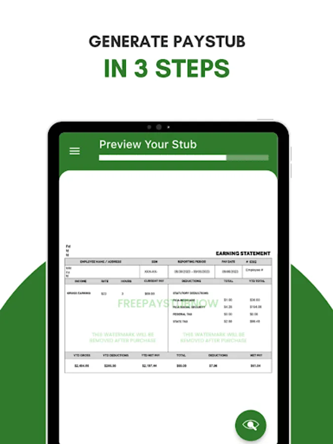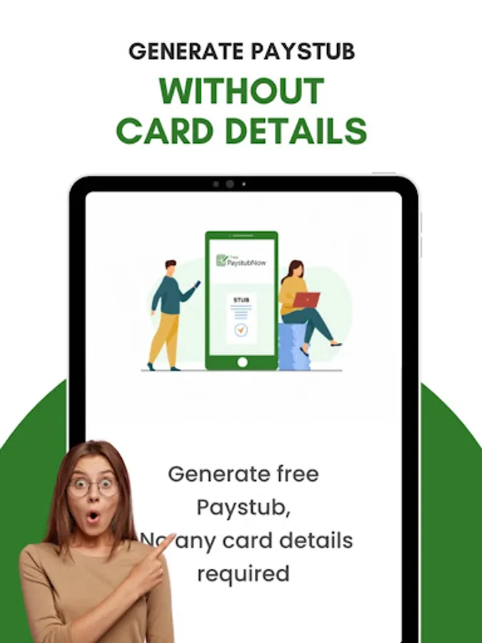 Our app is completely free to use as no credit card or debit card is required! Very Easy! Generate free pay check stub without any trouble and as much as you want.