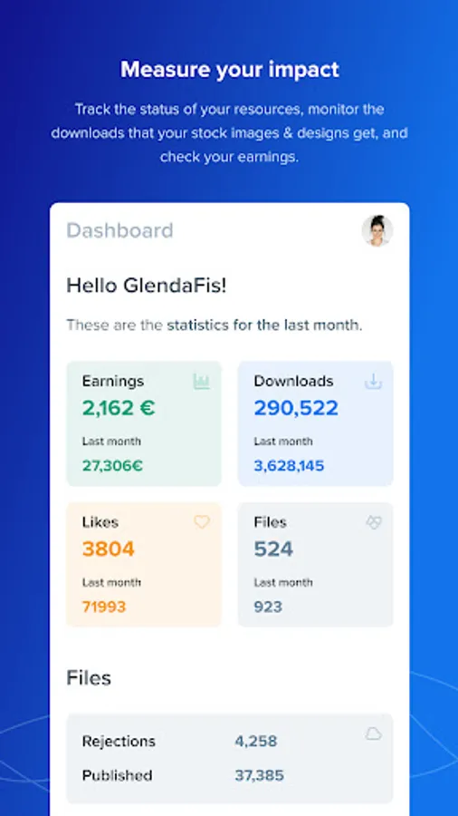Download the app to start tracking the progress of your files, monitor their performances, and view the number of downloads, likes, and earnings you've made. You can also check the trending searches on Freepik to upload content that performs best. This app allows you to measure your impact on Freepik effortlessly.