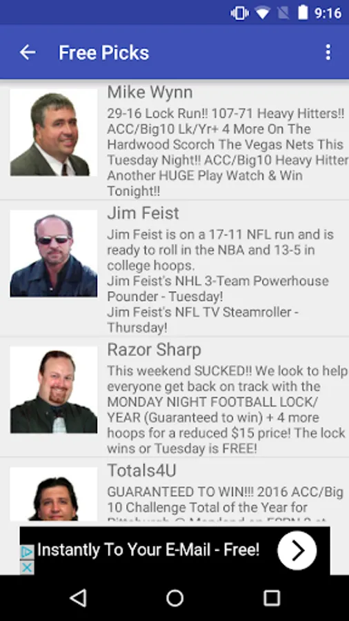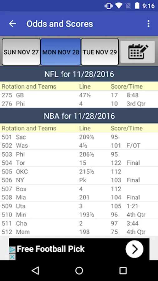 Get daily free picks from professional handicappers along with odds and scores for college and professional sports.