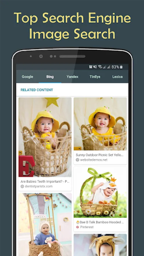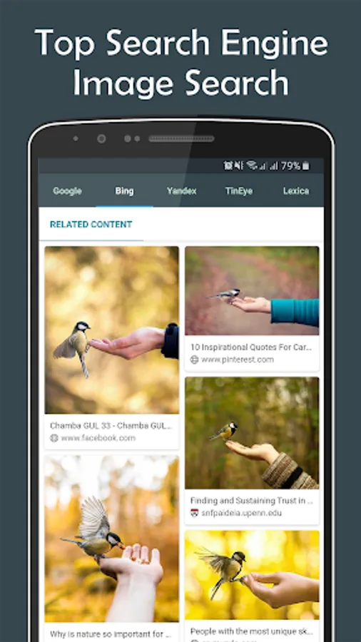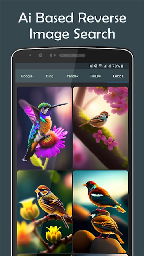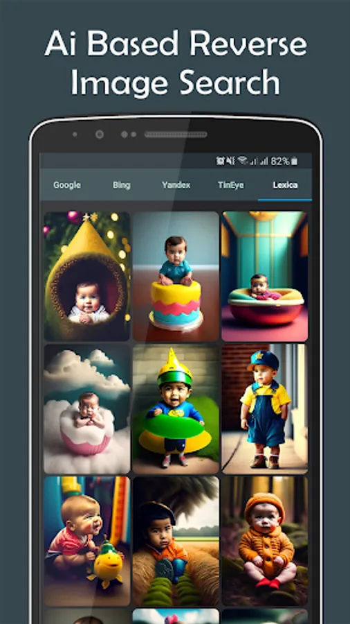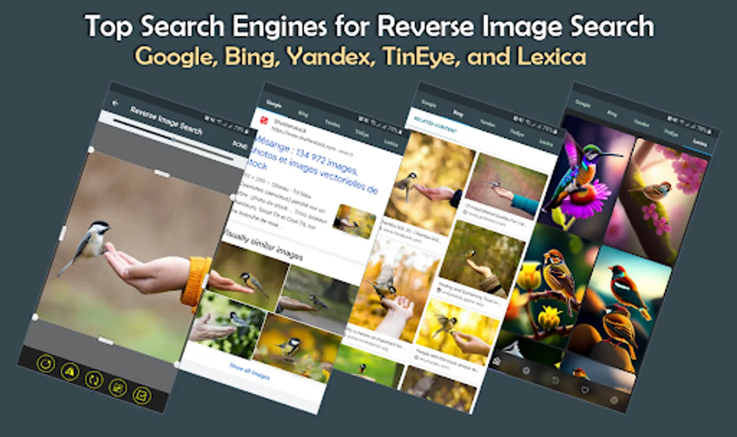 Reverse Image Search is the simplest and easiest photo searching app. With a single tap, you can search your image for matching images or personalities throughout the world. If you want to search for any image, or if you are searching for public photos, select one of his/her pictures. This is the best and most powerful free app to search by image or photo with speed and accuracy. The application uses the most popular and powerful Google image search engine, Bing image search, Yandex image search, TinEye, and Lexica (Stable Diffusion) which Ai based reverse image search engines for image searching purposes.