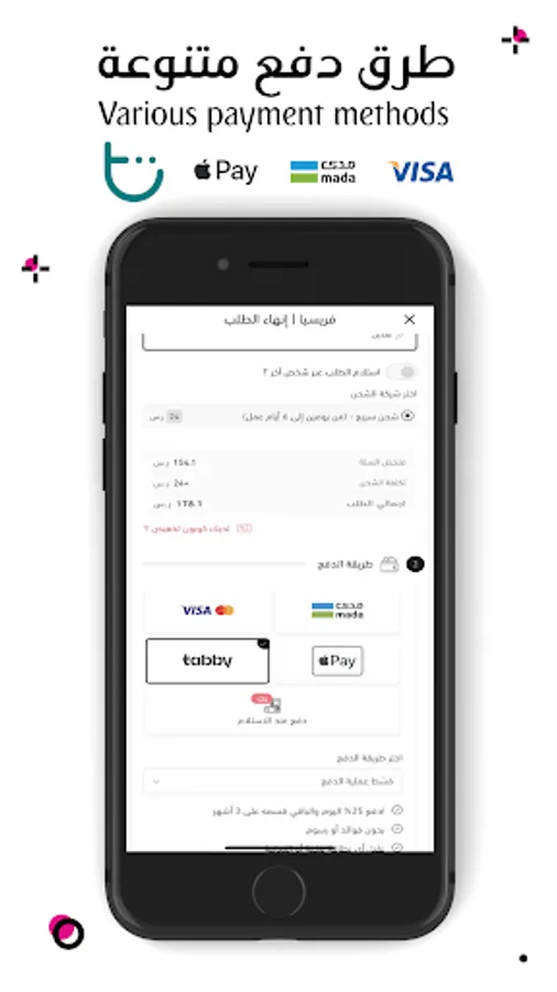 - Ease of payment, payment on receipt, bank transfer, payment via mada, Visa, or through Apple Pay.