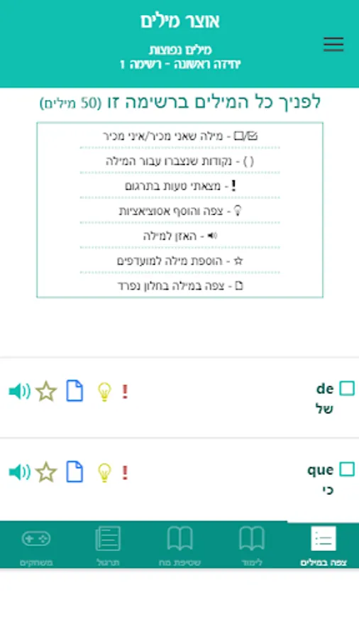 Our system includes the common words in the language, sorted, along with other useful words in the language (such as verbs) and enables smart learning so that your vocabulary will gradually improve until success! Our vocabulary system includes reading the words, saving words that are difficult for you, saving words that you got wrong a lot, lots of associations added by community members, progress meter, games, and more)