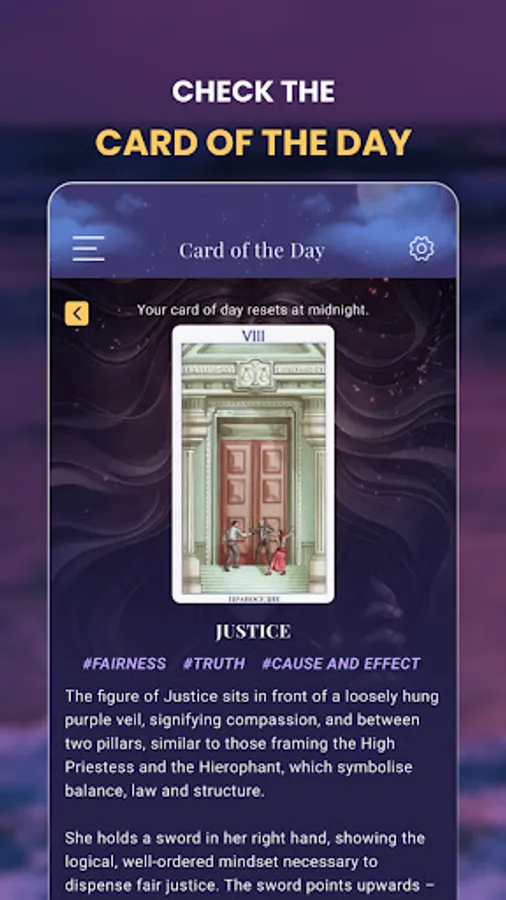 The application is developed based on real fortune-telling techniques that are used by real experts in Tarot divination. Divination is divided into periods: there are both predictions for each day and the beginning of periods (week, month, year). The values of the prediction cards may differ since the decks themselves are somewhat different. For example, the Waite deck is perfect for beginners, and some experienced tarologists make decks with their values.
