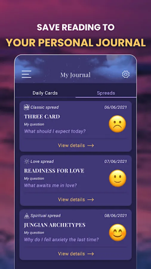 The app also has a "daily Tarot reading" feature, which is updated every midnight. Another convenient feature of KaDo - Tarot is a log of your layouts, for which the application remembers your action history.