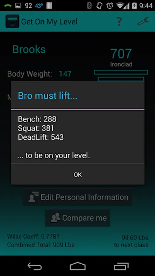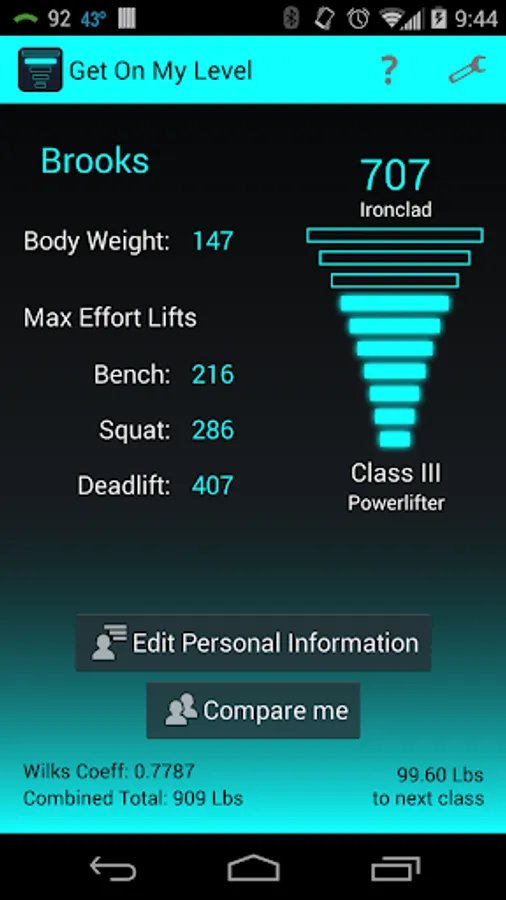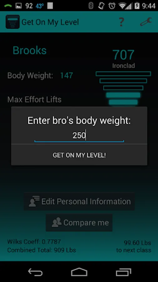Once you begin lifting, this phrase will go through your mind at least once a week. Lifters are competitive, especially the powerlifting type. Get On My Level was designed to be simple and lightweight - all you need is your body weight and a few max effort numbers. After entering your own numbers, simply type in another lifter's body weight and the app will generate the weight that lifter must lift to be on your level. Once this information is entered, the app will also calculate the following: