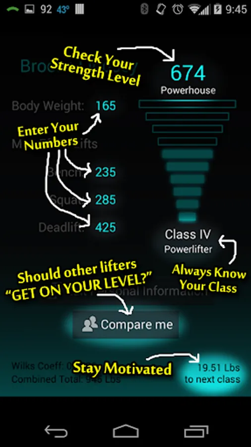 At the moment the app is very basic with no online connectivity. Eventually the app will enable each lifter to create an account for online ranking and to add friends to keep up with competition.