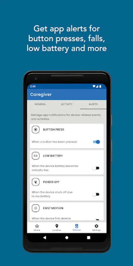 Receive app notifications for button presses, falls, low battery, power off, and first motion of the day