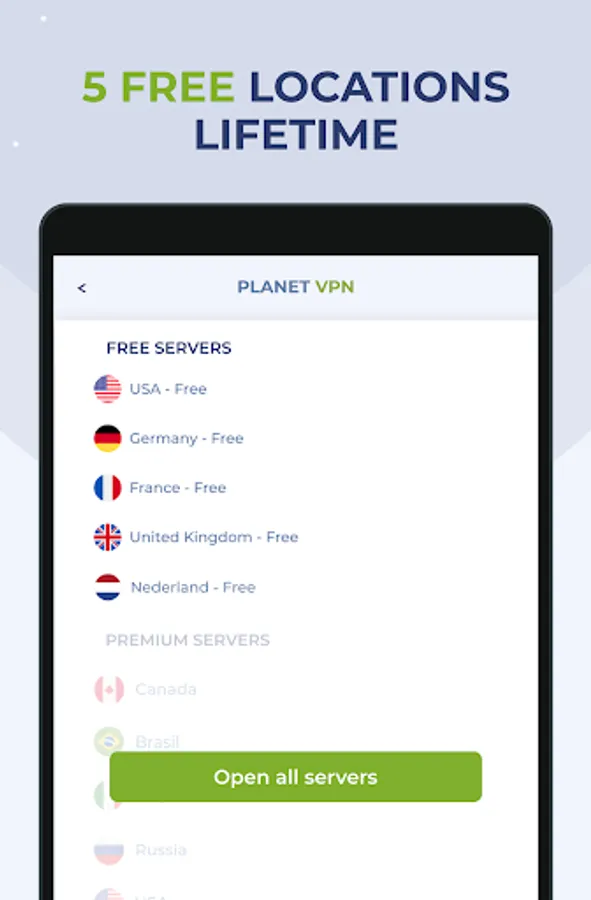 - It’s lifetime 100% FREE VPN. You don’t have any bandwidth or time limits - use VPN as much as you need with 5 locations - USA, United Kingdom, Germany, France, the Netherlands.