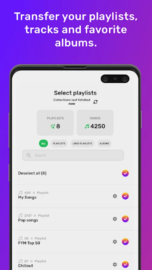 FreeYourMusic makes it super easy to transfer your playlists and enjoy them on any music platform. Move your entire music collection from one music service to another with just a few taps! You'll have all of your favorite songs imported on your new music streaming service in no time.