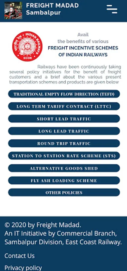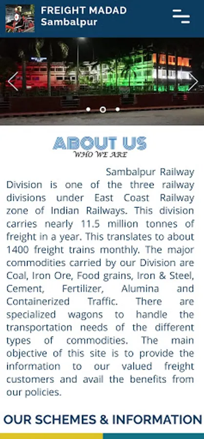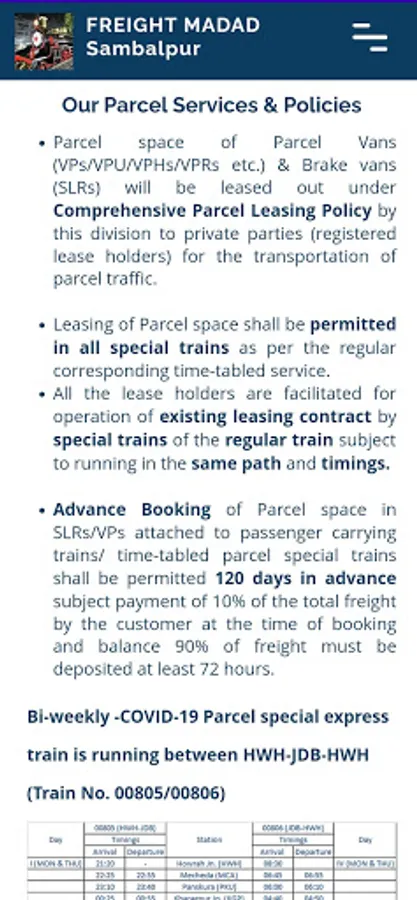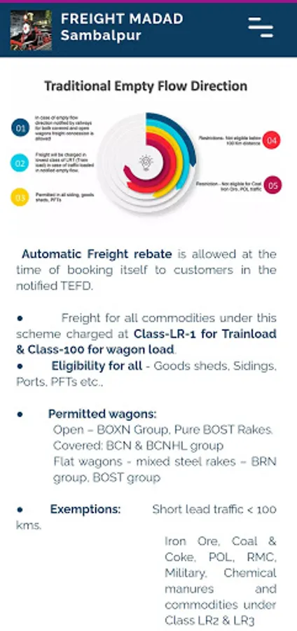 With an aim to increasing freight business, Railways have set up Business Development Units (BDU) across all Divisions. BDU of Sambalpur Division has designed and developed this app with a Customer First Philosophy and helps in familiarizing New freight customers with Indian Railways Freight Business and provides the information pertaining to all goods sheds, handled commodity as well as parcel services over the division.