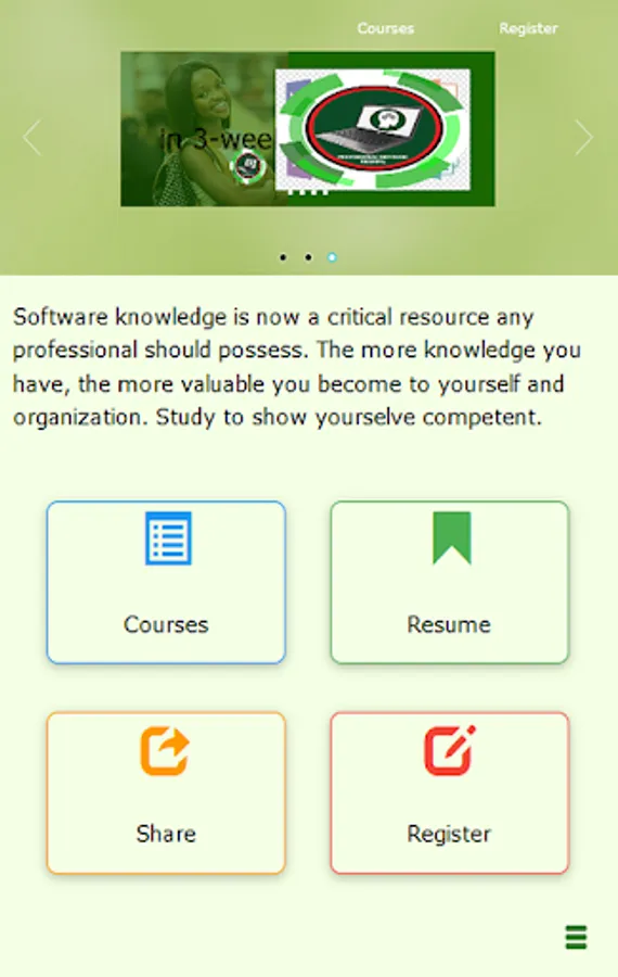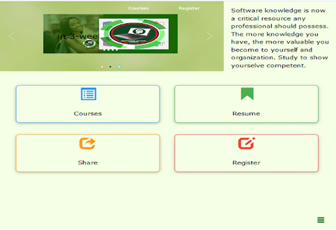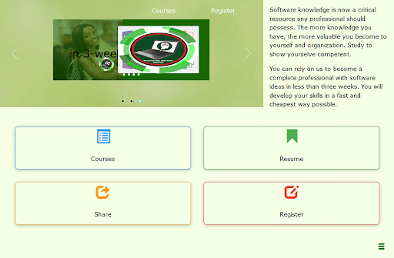 Professional Software Training (PST) app is for educational purposes. It addresses the software-usage challenges facing Individuals, Groups, and Corporate bodies, working in different scenarios.