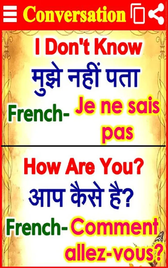 With the help of this French learning app, you can improve your French language speaking and learning in an easy way. French learning app has many useful French phrases words common conversation topics and sentences which can help you to learn French easily. This is an online/offline app that provides you an easy way to Speak French with confidence. Here you can get more information about French phrases and vocabularies in Hindi and the English language also. This app also provides some French words under many useful categories like – fruits vegetables names animals birds names and colors names sentences to learn and improve your French language vocabulary easily.
