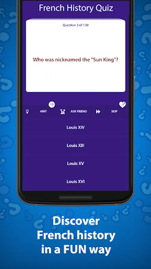Check out French History Quiz, a history quiz trivia game for all the history lovers! Test your limits with a new trivia game and learn more about French History! Have fun exploring with History quiz trivia game, and enjoy learning anytime. If you love France, French culture and French history, get yourself this quiz game app right away!