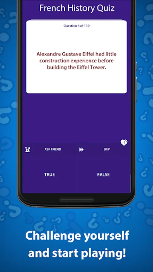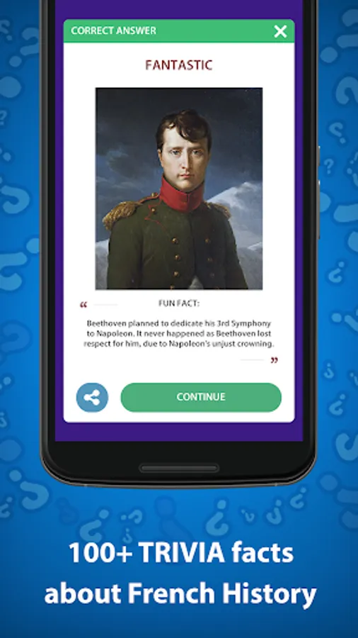 French History Quiz, questions and answers game offers 100+ history trivia questions about historical events of France, followed by interesting facts for real learners! Boost your general knowledge with history facts, answer all trivia quiz questions and most importantly, have fun learning! Download your new history trivia quiz for FREE!