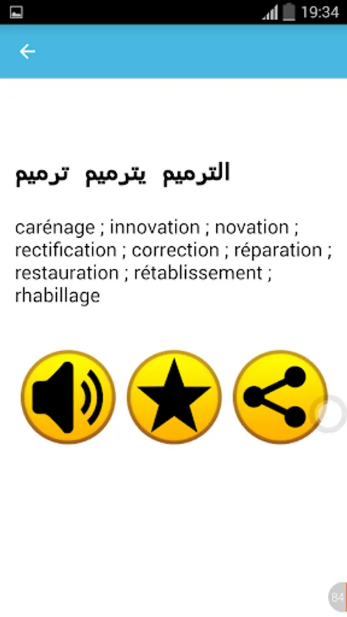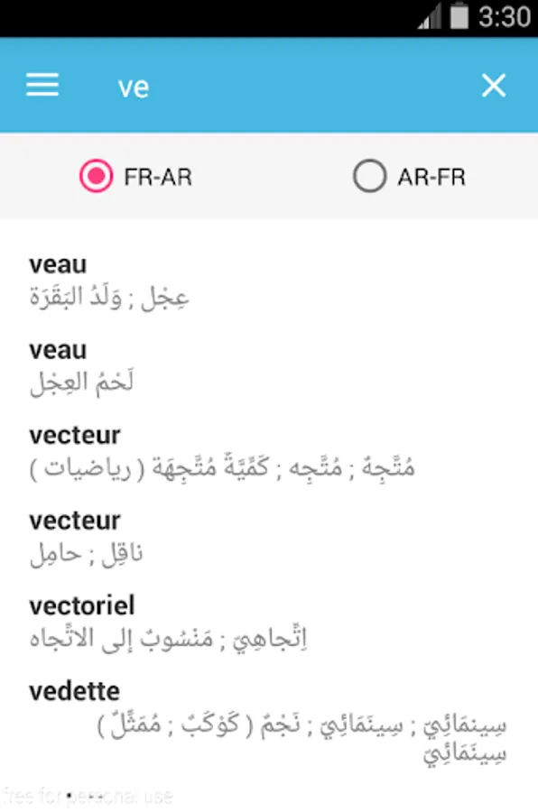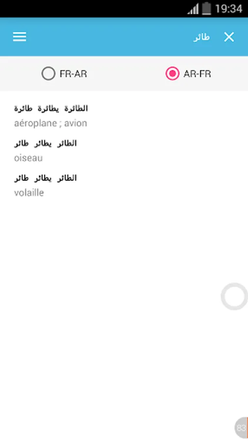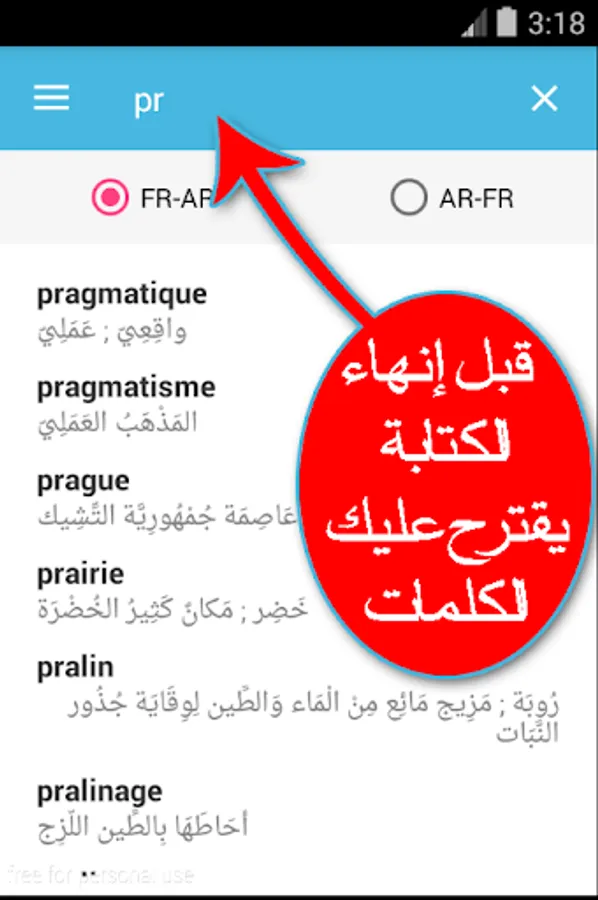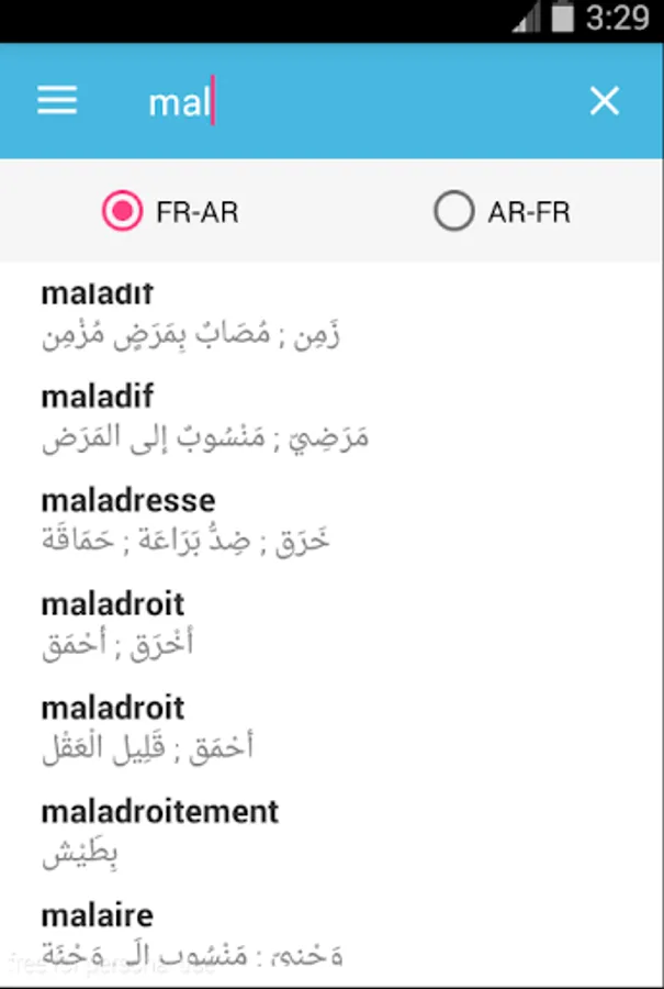 Dictionary interpretation dual professional to allow translation from Arabic to French and vice translation from French to Arabic professionally where you propose words as soon as you type the letter or the first of which letters.