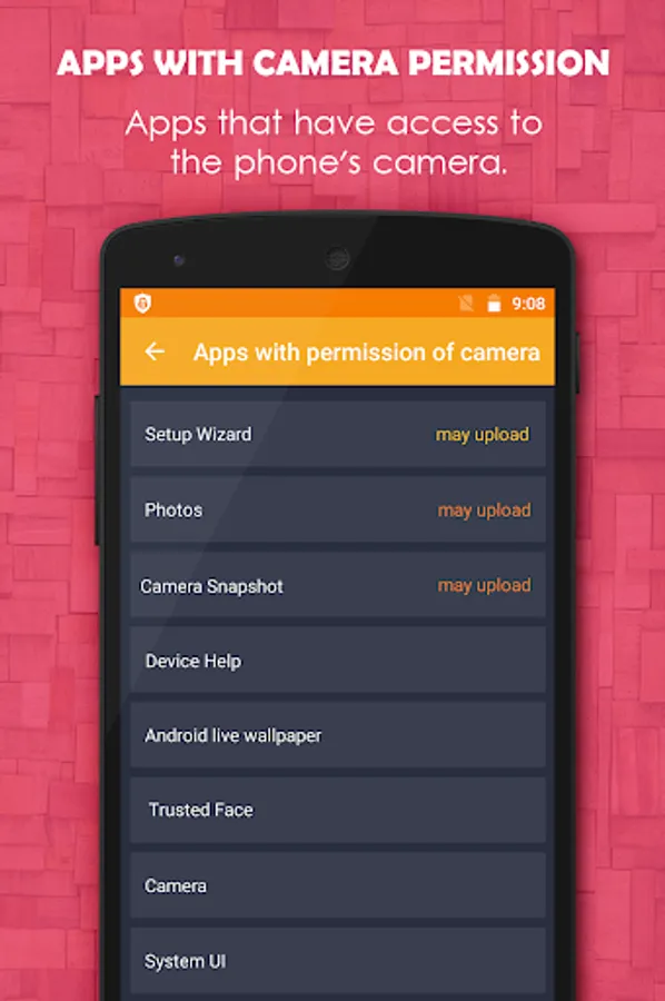 This app uses the Device Administrator permission. Within Device Administrator it uses the "Disable Cameras" security policy to protect phone cameras.