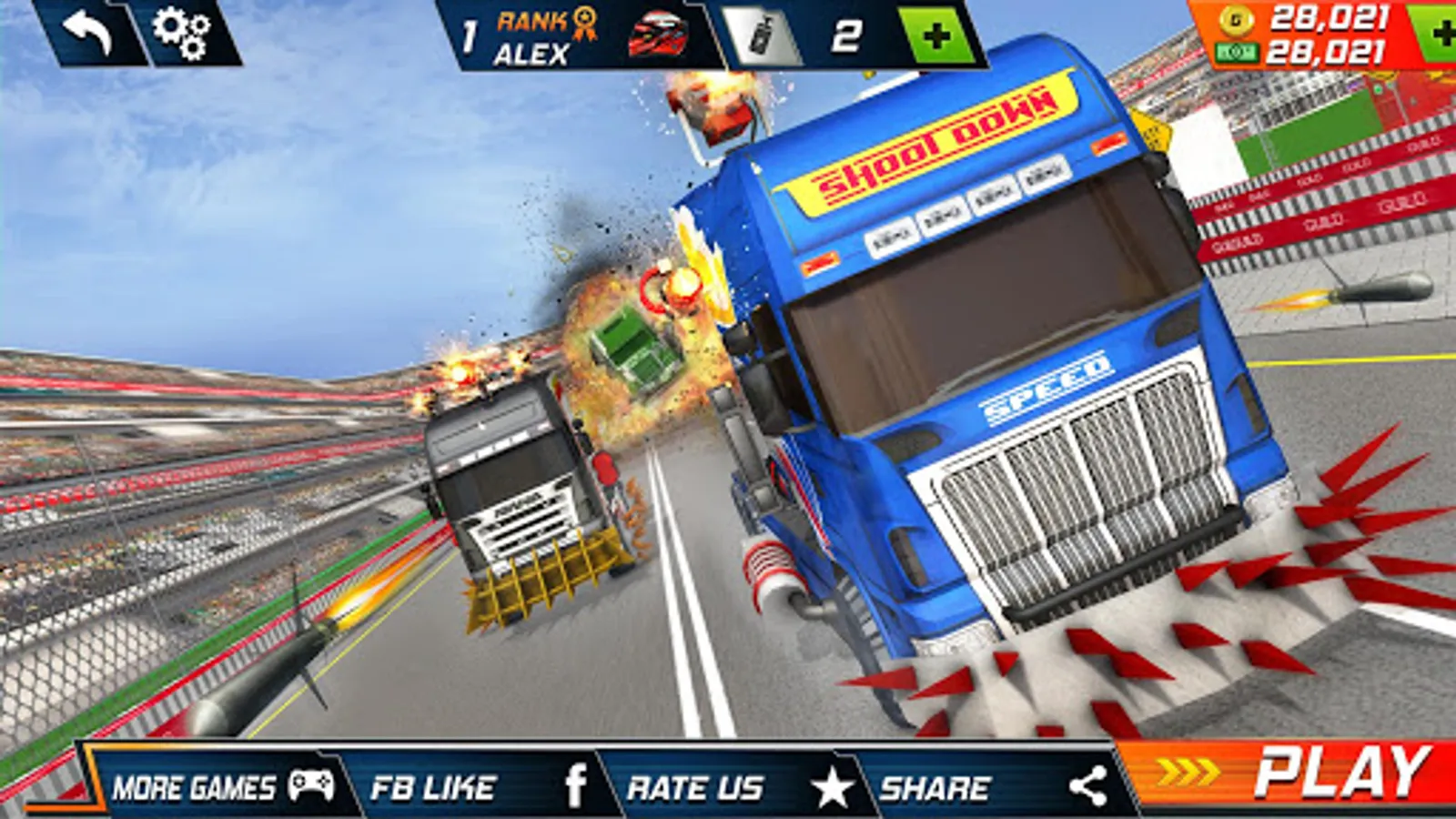 Are you ready to play the online multiplayer demolition derby racing game 2021? If yes then enter the dead race of battle trucks, which is the most amazing racing and shooting game, where each truck is equipped with guns and missiles. The ultimate truck death race 2021 game has no rules, just smash and demolish your rivalry truck to win the crash race. Drive semi-truck to race and shoot against friends or random offline racing rivals. Hit and smash the enemy vehicles using truck driving skills in semi-truck stunt games to become the destruction derby driver.