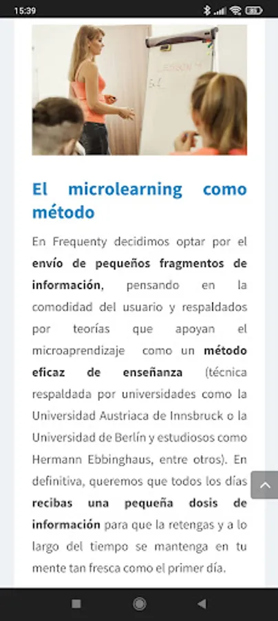 The method we choose at Frequenty (microlearning), is a technique that is supported by universities (Austrian University of Innsbruck) and scholars of pedagogy and learning. Microlearning or microlearning is an educational technique that stands out for the brevity of its lessons, the easy assimilation of them or the flexibility of the learning process. According to studies and theories such as those of the German academic Hermann Ebbinghaus (Universitat zu Berlin), it is proven that better rates of knowledge retention are obtained when it is consumed in small quantities and frequently.