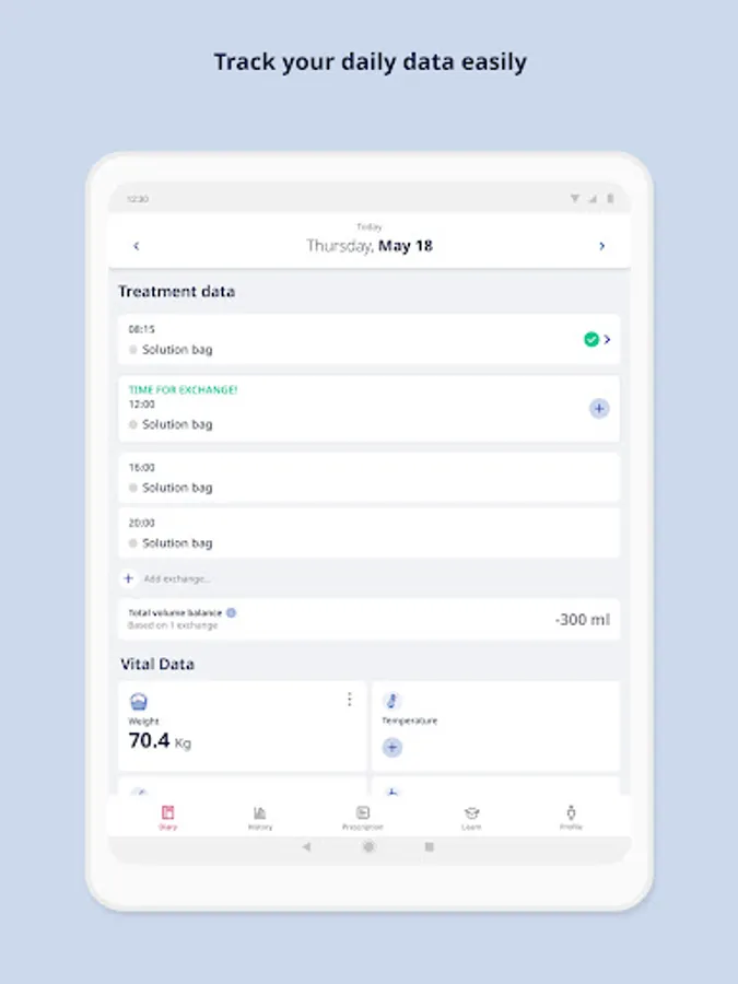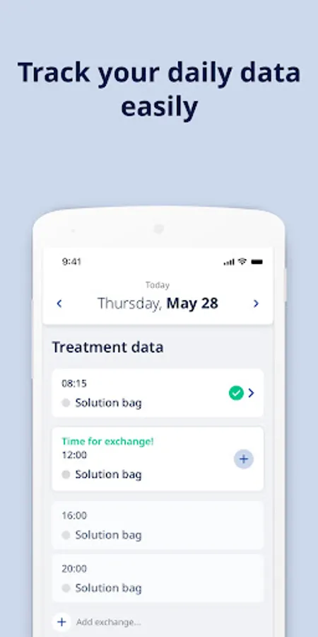 As a peritoneal dialysis patient you could keep track of your CAPD exchanges or receive treatment data from the APD cycler with only a few taps. Track weight, blood pressure, temperature and blood sugar. You can input vital data at any time of day, regardless of when exchanges are planned.