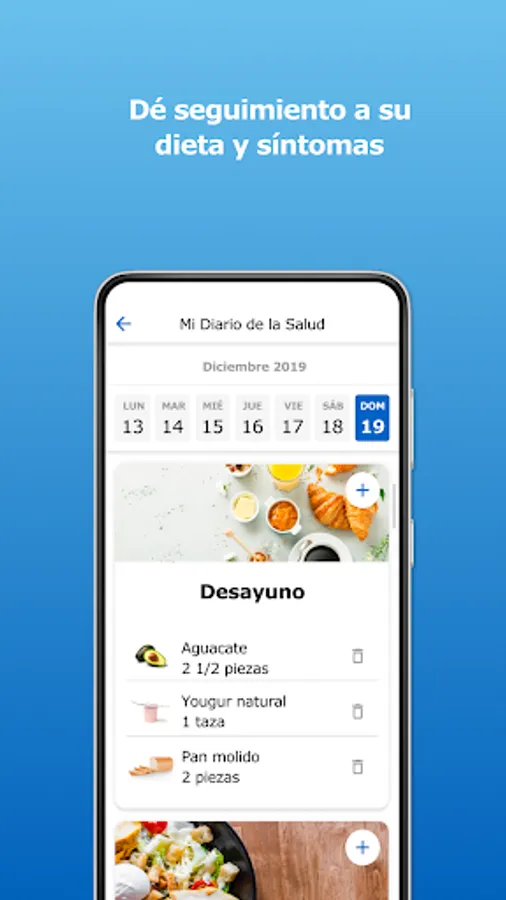 In this diary you will be able to record the food you eat during the day separated by each meal time; breakfast, snacks, lunch, and dinner, which will help you maintain a better adherence to your renal diet since it will show you the values of calories, phosphorus, potassium, protein, and sodium. If you are a CEAN patient, alarms will be displayed when you have exceeded your intake for each nutrient.