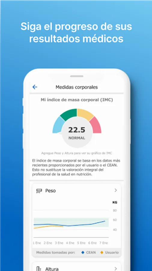 Here you will find a comparison of your results of your body measurements such as weight, your body mass index, blood pressure, glucose, creatinine, urea, phosphorus and potassium. If you are a CEAN patient, you will be able to see the measurements that are in your file, if you are not yet a CEAN patient, you will be able to see the measurements that you are recording. In addition, you will be able to record several values a day of blood pressure and glucose, a perfect tool for your better control.