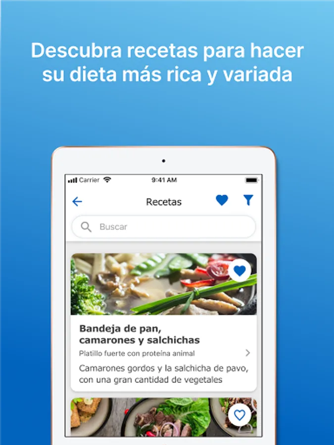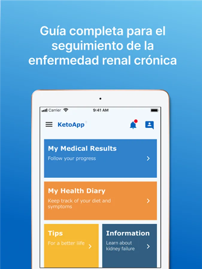 One of the most important tools of this application, since this is where you will find RECIPES specially adapted for the renal diet, the different NUTRITIONAL VALUES to know the characteristics of each food from a reliable source, such as the content of phosphorus and potassium. PHYSICAL ACTIVITY with advice and adjustments on exercises that could be recommended for the condition of a patient with chronic kidney disease. And in OTHER TIPS very important information about your quality of life, such as emotional balance, relaxation tips, recreation and leisure.