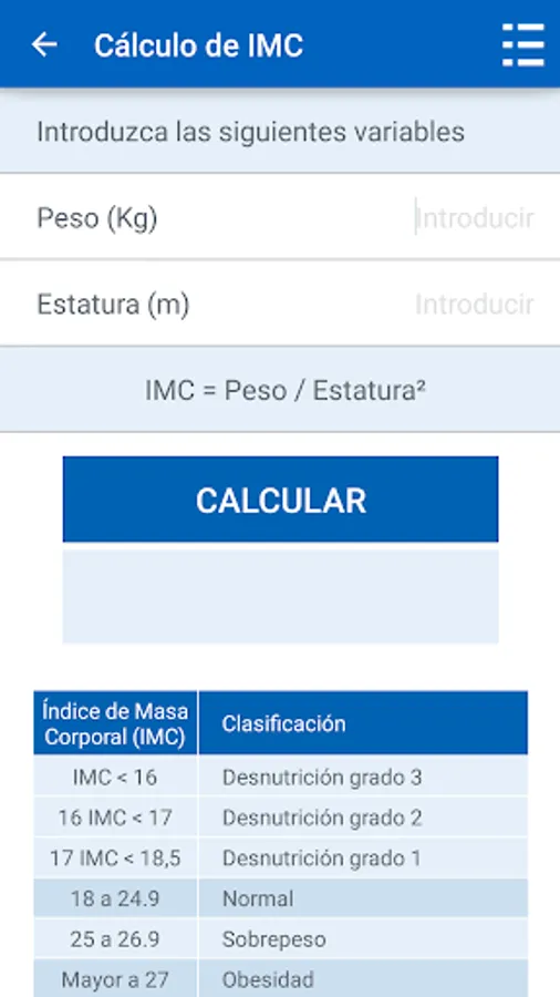 It contains practical tools necessary for the development of the professional work of nutrition, which will be useful in your day to calculate: body mass index, nutritional risk index, Harris-Benedict equation among others.