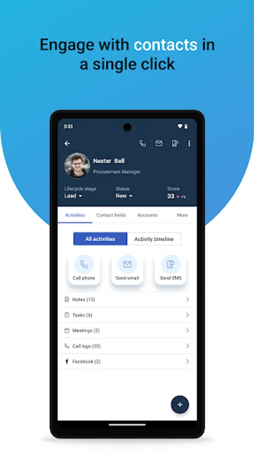 With key metrics on your mobile app, stay abreast of the latest contacts assigned to you. Use filters to narrow the right contacts and ensure they do not slip through. Pay attention to the warmest deals and change the stages as and when the deal progresses to the next stage. Send emails or make calls at the right time, engage contextually and shorten your sales cycle.