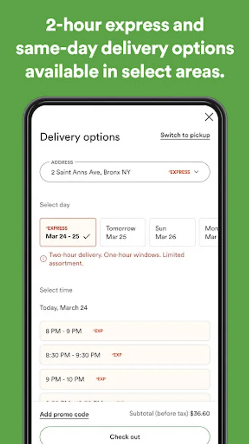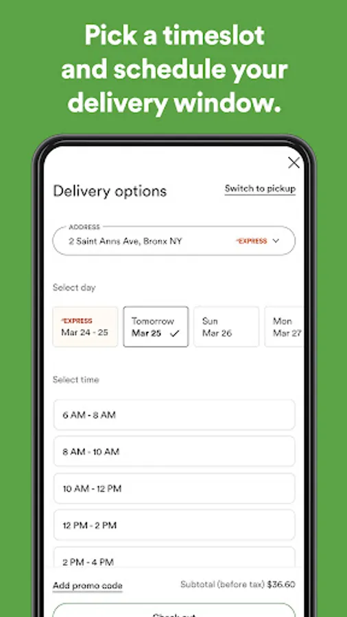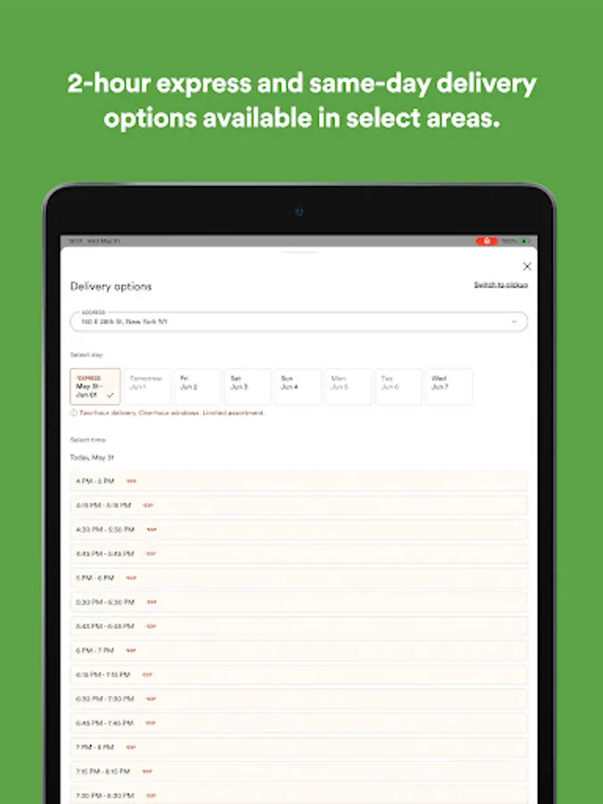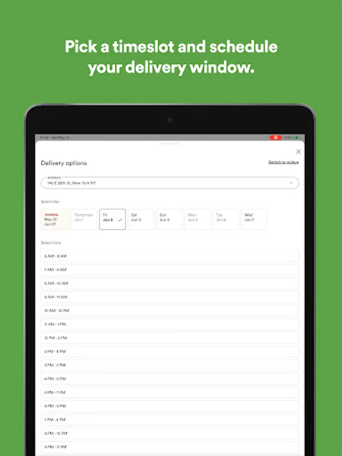 • Pick a timeslot and schedule your delivery window. 2-hour express and same-day delivery options available in select areas.