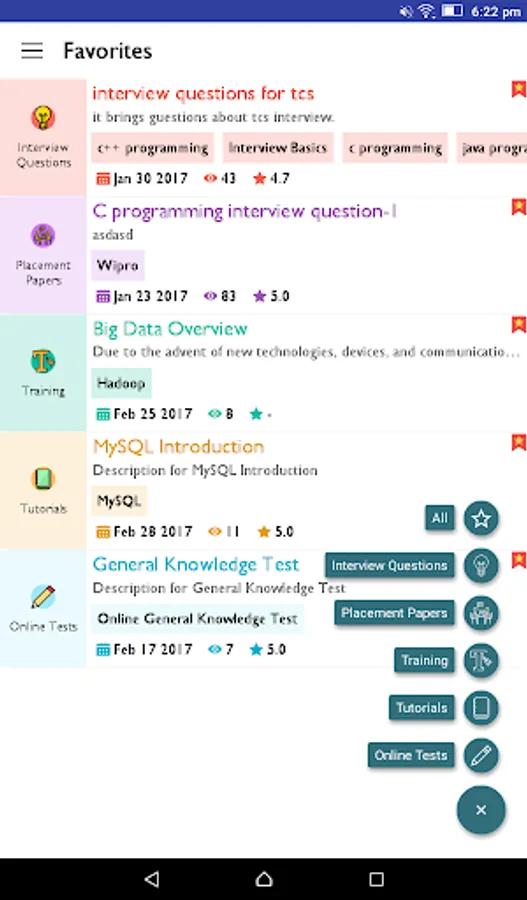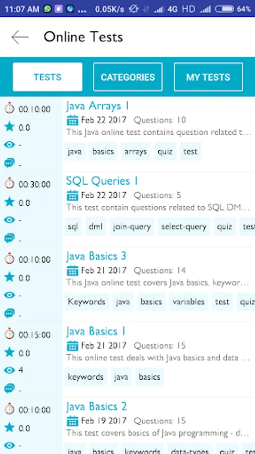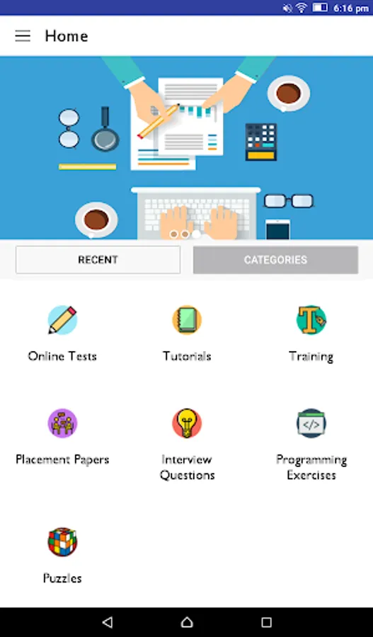 Tests and quizzes in various programming languages, tests in aptitude and verbal proficiency. The various formats of the tests like multiple choice, match the following, drag and drop etc. keep it interesting for you while also providing a real world experience. Some tests with time limit also enhance that real world interview experience. Tests are graded automatically and instant feedback provided to you, which should help in making you a better and successful interviewee.