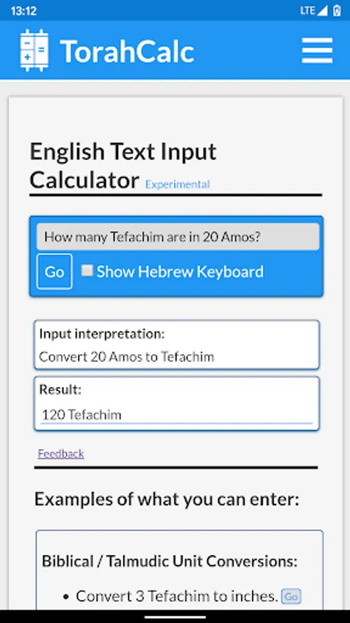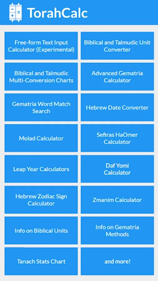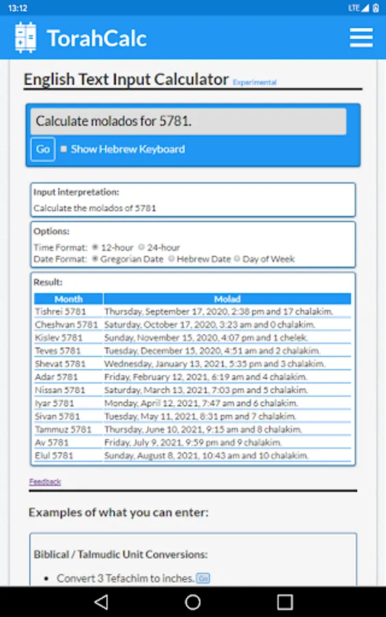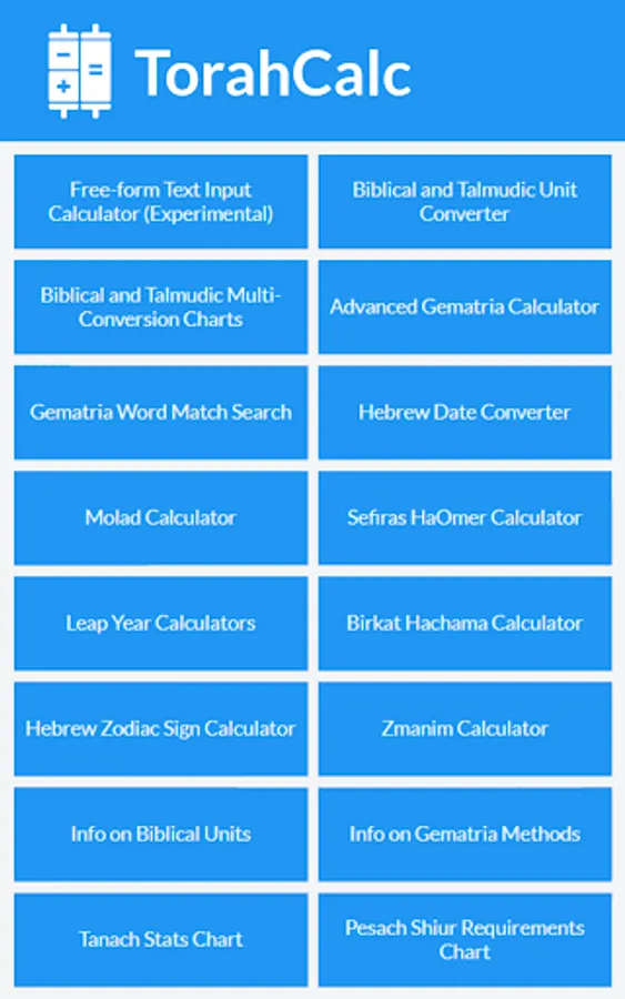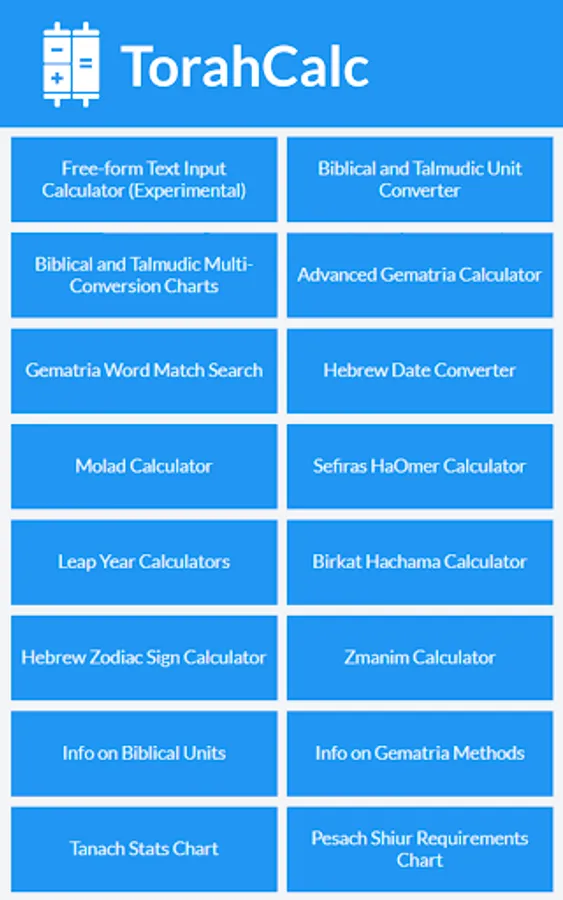 · English Text Input Calculator - You can currently type in requests for Biblical / Talmudic unit conversions, gematriah calculations, Hebrew calendar conversions, Molad calculations, or leap year calculations. More calculations coming soon.