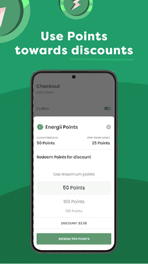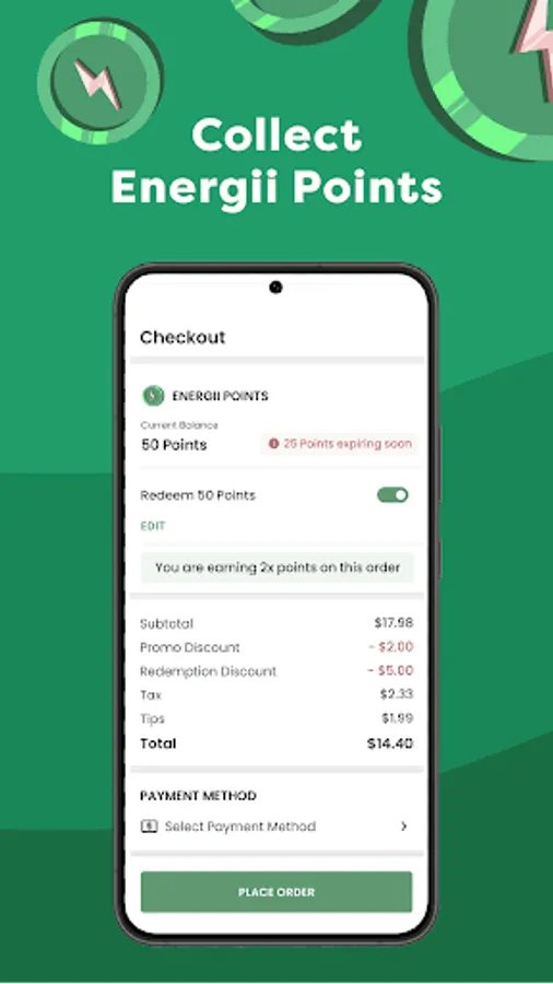 Earn Energii Points on every purchase that you can use for discounts off your meal.