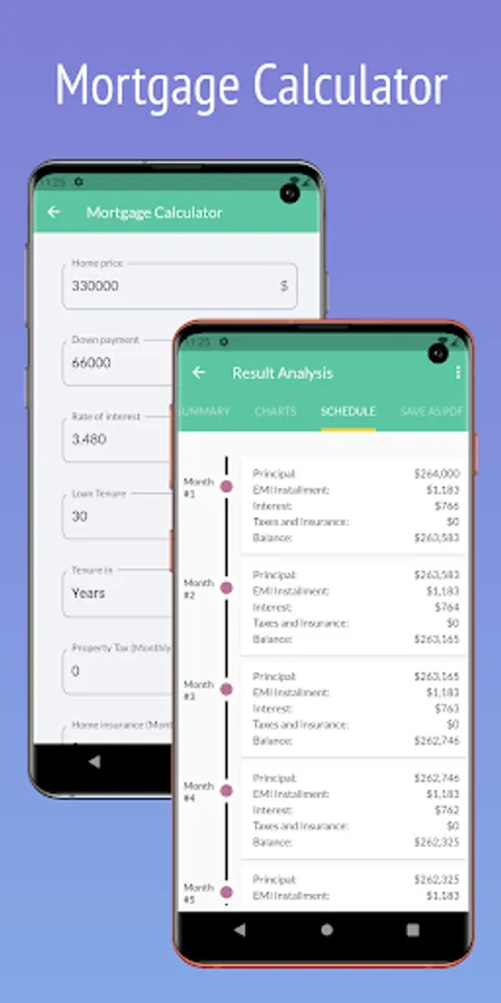 - PDF Report with Loan EMI / Mortgage payment summary and amortization schedule