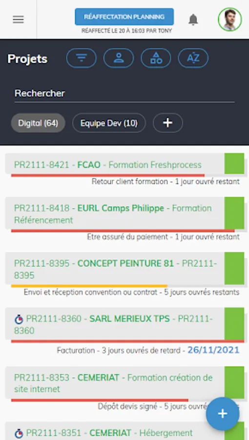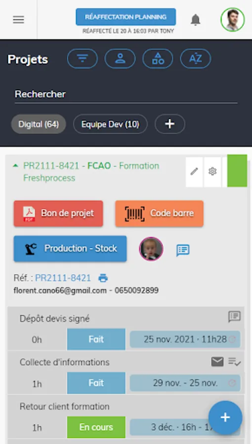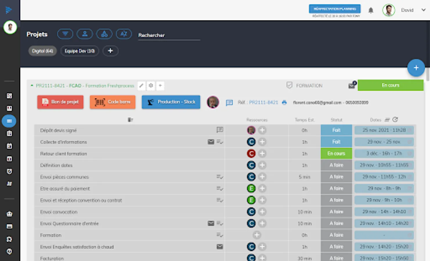 Freshprocess is a tool intended for printing professionals, the aim of which is to support them in their production and project monitoring. It offers the user real-time monitoring of current projects. Freshprocess also makes it possible to automate certain tasks such as validation, on the part of customers, proofs and customer alerts more generally.