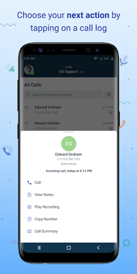 Follow up actions Tap on an item in your call history to return the call or view the call summary, notes and play the recording.
