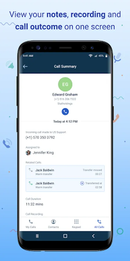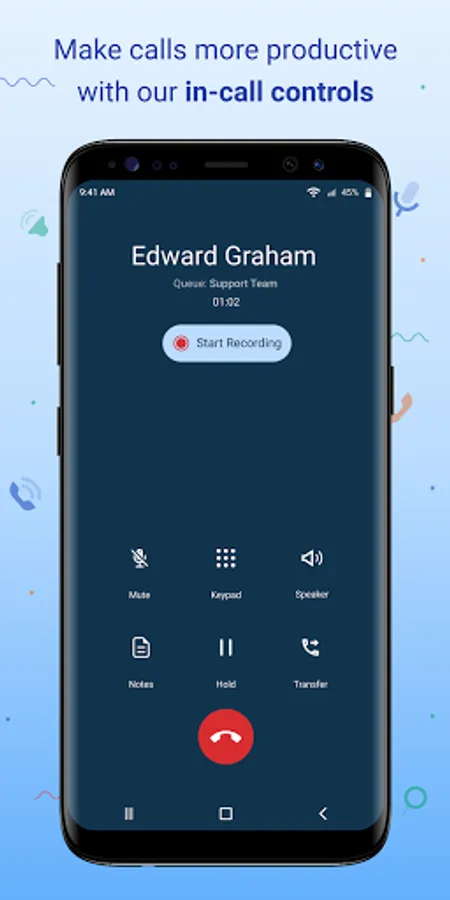 On-call functions: While on call, you can mute, transfer the call to another phone user, or put your call on hold to provide a clean customer experience. You can also navigate to other screens in the app while on the call.