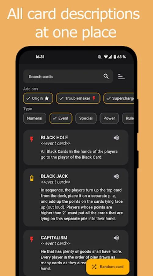 All existing cards can be searched and their descriptions can be easily viewed. Descriptions can also be read out directly via text-to-speech. In addition, random cards can be drawn, e.g. to draw event cards directly from the app. All add-ons are included in the app.