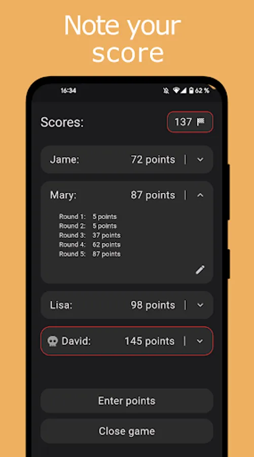 The points of each game can be logged directly in the app. All points are added immediately, so you save yourself annoying math and do not waste paper.